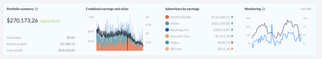 Affilimate is great for tracking affiliate income and user actions, Semrush for SEO stuff, and I just started using RankIQ to update old content and it seems pretty great so far.